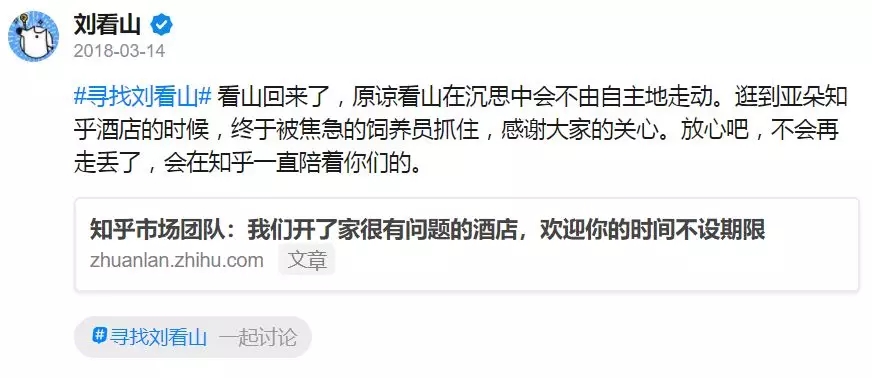 两天后的3月14日,饲养员们终于在亚朵知乎酒店找到了刘看山,知乎还顺便跟亚朵合作成立了个“有问题酒店”。